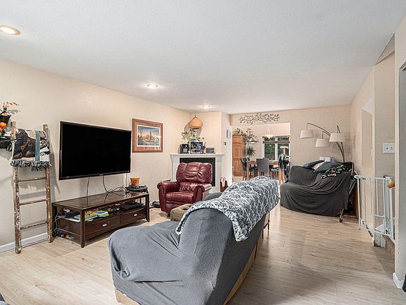 The heart of the home is the open kitchen with oak cabinetry, center island, snack bar, and pantry, flowing seamlessly into the spacious dining area and great room with access to the deck—perfect for entertaining or family time. The formal living room features a cozy gas fireplace, adding warmth and charm.