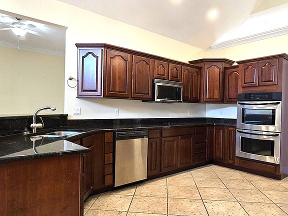 A welcoming entry opens to soaring cathedral ceilings and plantation shutters that fill the home with natural light. The main living area features a striking stacked stone fireplace and hardwood floors. The kitchen includes granite countertops, custom cabinetry, a double oven, and a separate cooktop range—perfect for those who love to cook or entertain.