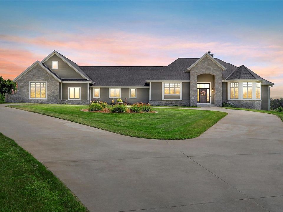 As soon as you step into this stunning custom-built ranch home with full walk-out finished lower level, you'll be surrounded by light, open space, & stylish design. Walls of windows offer panoramic views of the serene backyard with 80' diameter private pond. No detail was spared when building this home, with the primary bedroom suite boasting his & hers walk-in-closets & a huge tile walk-in shower with rainfall & dual shower heads as well as dual sink vanity. If you love entertaining, this home is perfect for you! Walk-out basement features movie area with projector, wet bar, dry sauna, hot tub, full bathroom, full size windows & patio doors out to the stamped concrete patio. No steps coming into 4.5 car attached garage, 50 x 30 outbuilding has bathroom, urinal & walk-up storage area.