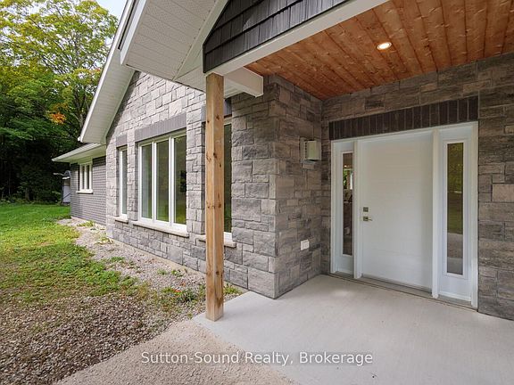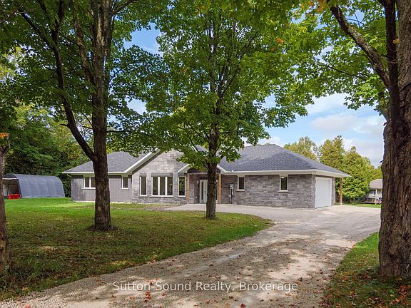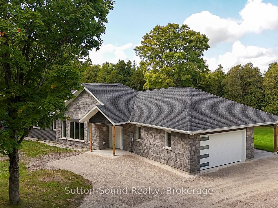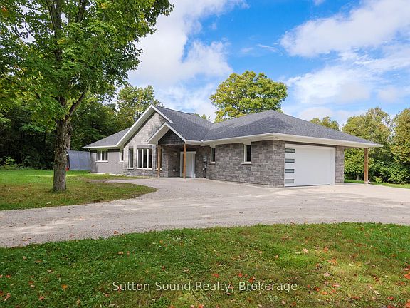 Discover this thoughtfully designed 2 bedroom, 1.5 bathroom bungalow, built in 2018 with sturdy stone and brick construction. Offering comfort, style, and convenience all on one level, its an excellent option for retirees or anyone seeking easy living. The covered front entry welcomes you with no steps into the home, ensuring accessibility for everyone. Inside, you'll find yourself at the heart of the home in a spacious open-concept living area, where high ceilings and large windows fill the space with natural light. A cozy propane fireplace adds warmth and charm to the living room, while the modern kitchen boasts stainless steel appliances, a gas stove, and a large island with seating - perfect for gathering with family or friends. The seamless flow of the layout makes it ideal for both everyday living and entertaining. The primary bedroom features ensuite access to a luxurious 4-piece bathroom, complete with a walk-in shower and relaxing soaker tub. Across the hall, the second bedroom overlooks the private backyard. The laundry room, equipped with a Maytag washer and gas dryer, offers a walkout to the covered patio - an inviting space to enjoy the outdoors. Additional conveniences include abundant closet storage and a handy 2-piece bathroom located off the garage, perfect for guests. Radiant in-floor heating throughout the home ensures steady, efficient warmth all year round. Outside, the property offers plenty of space and parking options with an attached 2 car garage, additional carport, and dual driveway access with fresh gravel, allowing for a circular drive. Set on a generous 1-acre lot, this home provides room to relax and enjoy nature, while still being just minutes from the amenities of Lions Head, Georgian Bay, hiking trails, and more. Blending modern design with the ease of one-level living, this home is a welcoming retreat on the beautiful Bruce Peninsula.