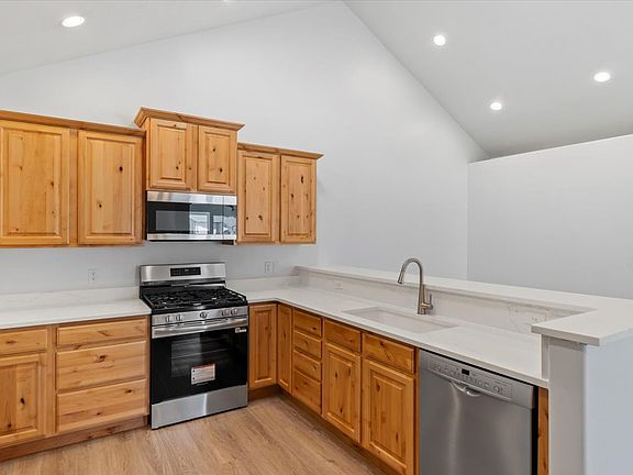 New lvp flooringNew gas rangeBright sunroomVaulted ceilingsQuartz countertopsWalk-in closetWalk-in shower