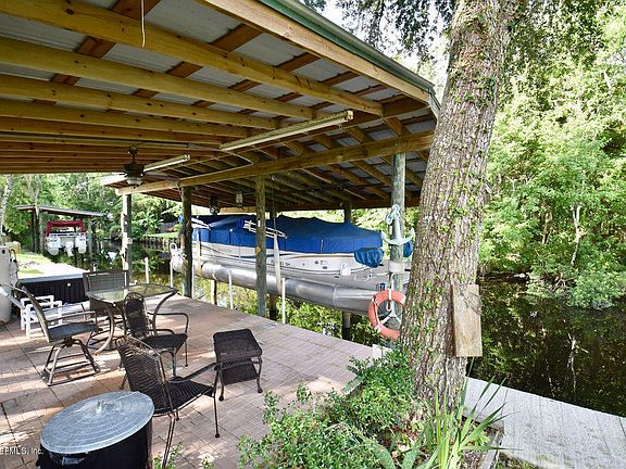 FISHING RETREAT! 2BR/2BA home with added room that could be used as a large living room, bonus room or 3rd BR. This is the perfect fishing spot for you! Home features short canal ride to river opening, bulkhead, dock, boathouse w/lift and plenty of room on the dock decking for sitting and enjoying the outdoors. This home has a beautiful landscaped yard w/concrete driveway, 26x25 2-car carport with hot tub and a storage shed w/fenced dog run & large covered front porch. The home comes furnished with everything you need to get started! Just bring your fishing pole and your favorite fishing boat and let the good time begin!