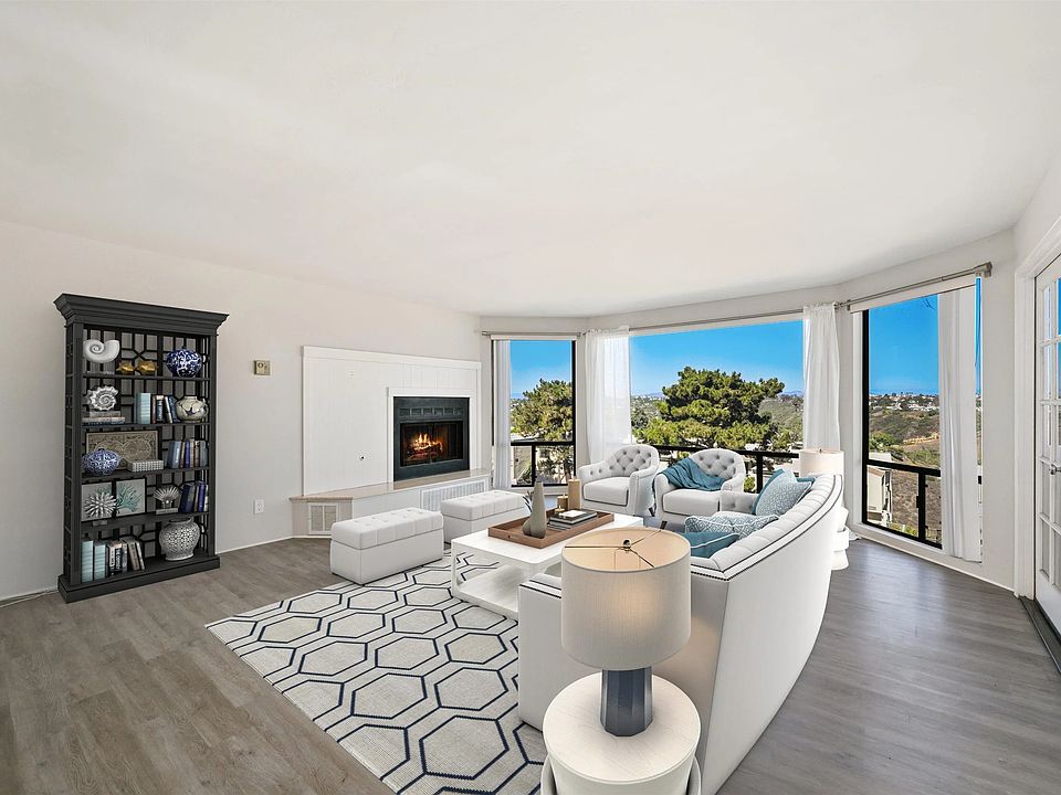 Experience stunning panoramic views from this beautifully updated end-unit home, where modern design meets everyday comfort. The open floor plan is enhanced by expansive windows that flood the space with natural light, creating an inviting and airy atmosphere. This rare single-level layout offers two generous bedrooms and two full bathrooms, including a spacious primary suite with a walk-in closet and private bath. The thoughtfully separated second bedroom provides the perfect setup for guests or a dual-primary feel. The stylish kitchen features sleek quartz countertops and stainless steel appliances, ideal for cooking and entertaining alike. Additional highlights include interior laundry and a large 8x8 on-site storage unit. Perfectly situated in the heart of Bay Park, you’re just a short stroll to dining, shopping, coffee spots, parks, and the trolley, with easy access to golf and Mission Bay. Blending comfort, style, and an unbeatable location—this home captures the essence of San Diego living.