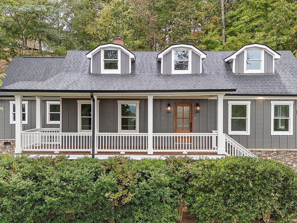 The main level shines with refinished hardwoods, abundant natural light, and a seamless flow between two inviting living spaces separated by a cozy gas log fireplace. The chef's kitchen is the heart of the home with its oversized island, quartz countertops, and stainless steel appliances—perfect for gatherings large and small. The spacious dining area features gorgeous trim details, while the screened-in porch and covered front porch offer the perfect spots to relax and take in the stunning views. A serene primary suite with a tiled shower and an additional main-level bedroom (or home office) add convenience and flexibility.
