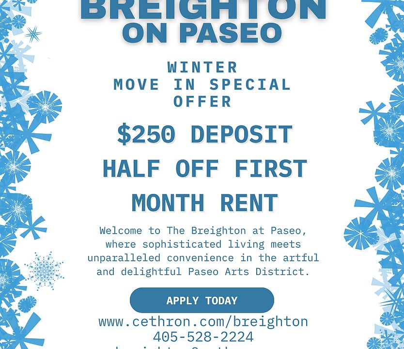 Kusama- Half off first months rent + $250.00 Deposit move in special! - $250 Deposit + 50% off first months rent for all approved leases signed by October 31st! Come join us here at The Breighton on Paseo and enjoy these specials as well as Reduced Renovation Rates while the dust settles from our clubhouse remodel! **Coming soon: upgraded fitness center, laundry center and community area