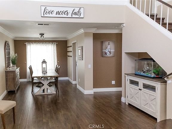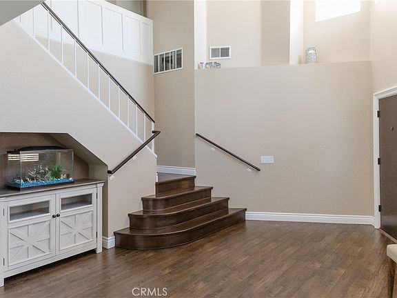 Updated and Turnkey 2000 sqft. 4 bedrooms and 3 bathrooms with a downstairs bedroom and bath. Located in the East Highland Ranch community. Upgrades include but not limited to newer 2 yr old heat/AC system, flooring, wood stairs, and paint. Updated kitchen with white cabinets, stainless appliances & sink, and Granite tops. Crown molding, Tall base molding, and door frames installed throughout the home. You will love the bright open airy feel as you walk in and see the living room and dining room with TALL vaulted ceilings. The kitchen has been updated and has newer appliances. A separate eating area opens up to the family room with a cozy fireplace. There is a downstairs bedroom and a bathroom with a shower!!! Interior laundry area. Upstairs you will find a loft area, which is currently being used as a children's play area but could be an office, library, or another family room. The two bedrooms are spacious and have newer windows. The full guest bathroom has been updated. The master suite is spacious with tall vaulted ceilings, and an amazing balcony. Master bath is updated offering a large soak tub and full tile walls. The backyard is spacious with no neighbors behind looking in on you. The backyard is just the right size not too big and not too small and has a large, covered patio and vinyl fencing. The 2 Car attached garage offers direct access to the home. Being part of the East Highland Ranch, you will enjoy all the amenities The Ranch has to offer such as walking trails, pools and so much more. No Mello Roos (Low Taxes), No solar or anything to assume. This is a great family home in a superior location. Make your appointment today to see this home!!!