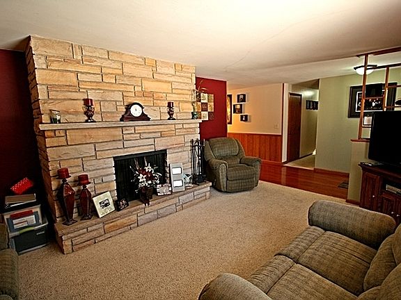 3 Bedroom, 2.5 bath ranch features 2 stone fireplaces, Beautiful wood flooring thru kitchen dining and foyer. Kitchen skylight. Gorgeously bright sunroom with 2 skylights and tongue and groove cedar cathedral ceiling, Master bedroom has 1/2 bath. 2 closets. Nice large yard. Lower level has fireplace and bar. Updates per Seller: Roof 2 yrs, Furnace 5 yrs, Water heater 7 yrs, Deck 2 yrs, Dishwasher 1 yr, Stove 3 yrs, New Garage Door. Awesome home!