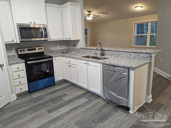 Completed, brand new home Move in ready December 2023! This Home Sweet Home is the lowest price, best value new home on the market and is in the perfect Location with easy access to I-10 and Hwy 90. Pace, Milton, Gulf Breeze, Pensacola. Open split floor plan with 10 to 11 foot soaring ceilings in the foyer and main living areas. Local Builder providing both quality construction and extra amenities for energy savings which includes a High Efficiency Energy Star HeatPump System with 10 year parts and labor warranty, spray foam insulation in the ceilings and the security of a RING Doorbell for smart living and peace of mind. Whirlpool or equivalent Stainless Steel Appliances including refrigerator, Luxury Vinyl flooring throughout this beautiful home with custom built, Solid wood cabinets and granite countertops in the kitchen and bathrooms. Lots of Closet space through out. Indoor laundry room and one car Garage with opener. Includes sod, paved driveway and paved road. Hurry, for the perfect time of year to make this beauty your new home sweet home.