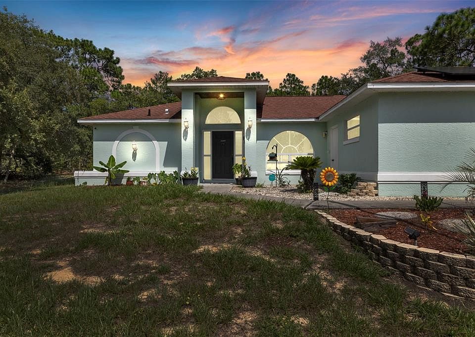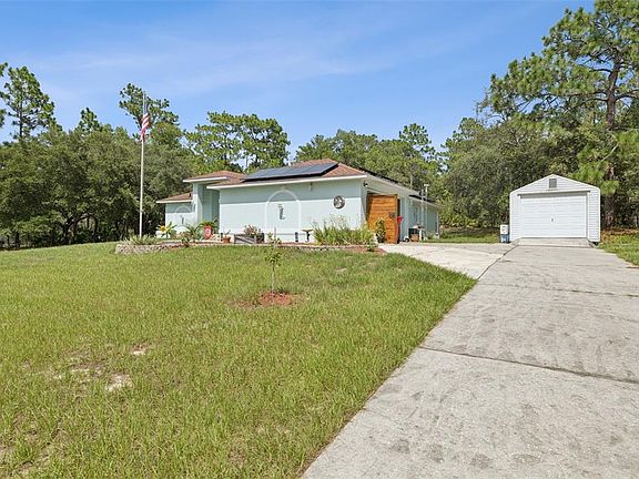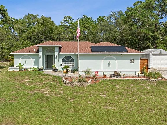 Discover timeless comfort and energy-efficient living at 2931 W Beamwood Drive in the heart of Pine Ridge Estates. a beautifully maintained custom-built residence located in the sought-after equestrian community. Sitting on a scenic 1.06-acre corner lot, this thoughtfully designed 3-bedroom, 2-bathroom home with an attached 2-car garage offers privacy, functionality, and a peaceful country lifestyle. Mature trees, lush landscaping, and a long private driveway create a serene setting with plenty of space to spread out, entertain, or simply enjoy the quiet surroundings. Inside, you'll find a spacious and open layout featuring vaulted ceilings, skylights, a formal dining room, and a large great room—perfect for both everyday living and entertaining. The custom kitchen boasts solid wood cabinetry with butcher block countertops, a large farmhouse sink, new stainless-steel appliances, a walk-in pantry, and a bright breakfast nook that overlooks the backyard. Luxury vinyl plank flooring throughout the living areas, while all three bedrooms are finished with plush carpet for added comfort. The split-bedroom design ensures privacy, and the primary suite features a walk-in closet, dual sinks, and a tiled walk-in shower. Sliding glass doors from the primary suite lead out to an expansive screened lanai—a perfect space to enjoy Florida’s outdoor lifestyle in comfort and shade. This home is equipped with a 2023 solar panel system, significantly reducing your energy costs and will be PAID by the SELLER AT CLOSING. The current electric bill averages just $35/month giving the new owner long-term energy savings. Other key updates include a new water heater (2023), roof replacement (2017), and HVAC system (2013). A detached workshop/utility building offers versatile space for storage, hobbies, or equipment. Located in the highly desirable Pine Ridge Estates, this home comes with access to one of Citrus County’s premier equestrian facilities. The community features over 28 miles of deeded horseback riding and walking trails, a full-service equestrian center with 13 tree-shaded pastures, auto-waterers, flexible horse-safe fencing, a large main riding arena, jump ring, dressage arena, obstacle arena, and round pen. Residents enjoy a low annual HOA fee of just $95/year, making this an exceptional value for the amenities and lifestyle offered. Situated just minutes from shopping, dining, golf, and the Crystal River coastline this home offers a rare opportunity to enjoy energy-efficient living, modern upgrades, and a true connection to nature—all within a vibrant equestrian community. This is more than just a home it's a lifestyle. Schedule your private showing today!