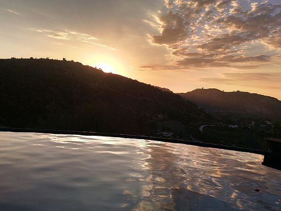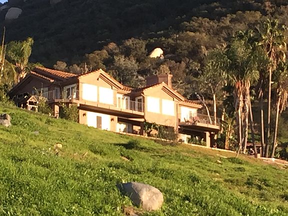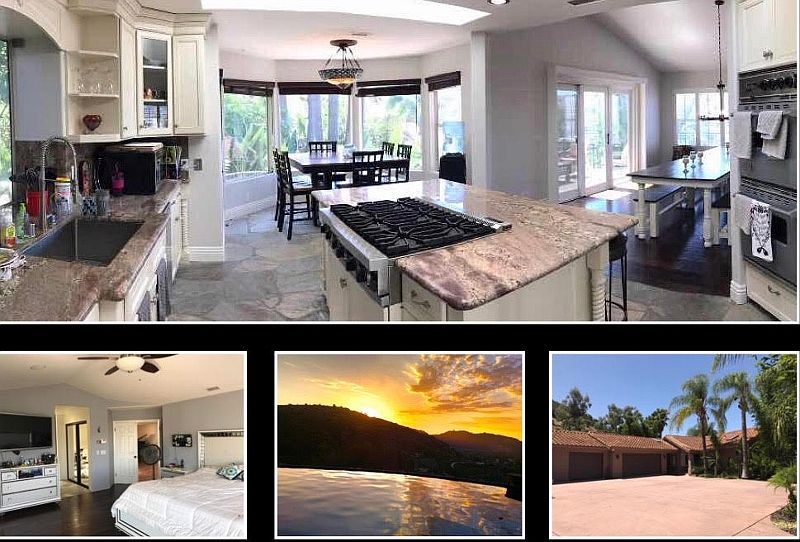 Gated Tropical Mountaintop Paradise with forever Views, spectacular sunsets and tons of parking & privacy. Just 1.7 miles from I-15 Open, spacious 3310sqft on 3.3 acres. Entertainers dream, Chef's Kitchen w/ Viking Appliances/Granite counters, infinity pool, 4 beds, 5 remodeled baths /2 Master Suites, one on entry level & one below with private entry complete with wet-bar (kitchenette) lives like single story, may be good for large families or guest house/granny flat. to view call/text Karen 760-277-1399 *************************** So many details make this home special! The chef's eat-in kitchen has a center island with Viking Range, Refrigerator, Dual Ovens and views. The counter tops are slab granite with painted mahogany cabinets, has nice walk in pantry and great storage. The views from every room are spectacular. All windows are dual pane, most with plantation shutters. Upstairs master suite has a balcony and a spacious open concept natural stone master bath with HUGE walk in shower with views, rain-shower, bench and beautiful stand alone tub, 2 walk in closets, dual sinks and more views! All 5 bathrooms have been remodeled with natural stone, granite counters and new vanity cabinets. The heart of the home and entertainment central is the downstairs Family/Pool room with fireplace, wet bar and easy access to the vanishing edge pool /spa and sprawling yard that is fully irrigated. The home is equipped with dual zone AC/Heat and fire sprinklers. Entrance gate is powered with a solar panel and the great child's play set. Much attention has been put into making sure the home is fire safe with fire sprinklers and maintaining a 250 ft. fire clearance around the home.. A must see! 2 beds 2 bath downstairs with wet bar and small refrigerator can be turned into a kitchenette. Has private entry that can be used for extended family, guest house, granny flat. Has side access with no stairs that may be used for wheelchair access to downstairs living area if inside stairs are not able to be used. Many possibilities a must see!