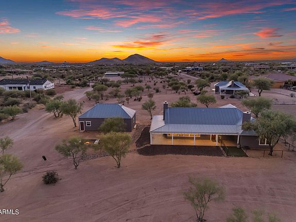 PRICED TO SELL!! Welcome to your very own ranch in North Scottsdale in the desirable 85262 zip code. This rare, just under 5 acre property in the Rio Verde Foothills offers privacy and tranquility on a dead end road, and features a pitched metal roof and charming wrap around porch perfect for outdoor living while enjoying the scenic views of Four Peaks, Weavers Needle and the McDowell mountains. A full size windmill adds a picturesque touch to the desert landscape as you sit outside to take in the beauty of the Arizona dessert. The main residence boasts two stone fireplaces that add to the inviting atmosphere in both the primary bedroom and main living area. The high ceiling and numerous windows in the great room enhance the sense of openness making the room feel like an extension of na The newly remodeled kitchen is modern and stylish designed for both functionality and aesthetics. Additionally, the property includes a separate 2 bedroom, one bath 1000 ft.² Casita is ideal for guests or additional living space and is currently used as an income producing residence. The casita also has an inviting fireplace in the main living area along with a wraparound porch and pitched metal roof and stunning views that match the main home.