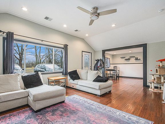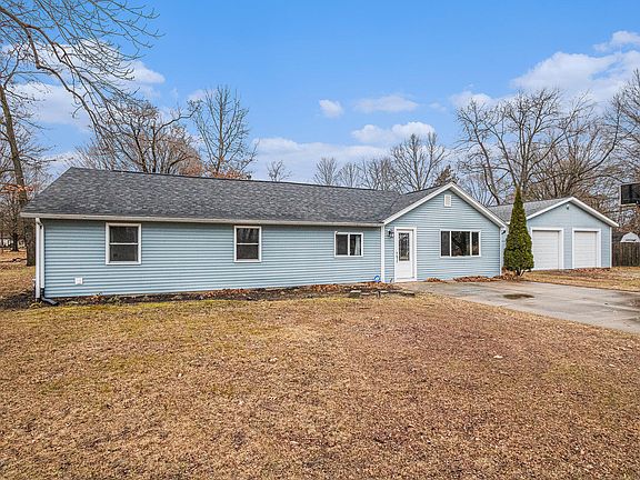 Nestled less than a mile from the state line, this well-maintained 3-bedroom, 2-bathroom home sits on a spacious 1.7-acre corner lot and offers modern updates throughout. Since 2017, key improvements include a new roof, well, fully fenced backyard, furnace, AC, sliding door, and dishwasher. The semi-open floor plan seamlessly connects the kitchen and dining area, while the vaulted ceiling in the living room enhances the sense of space.