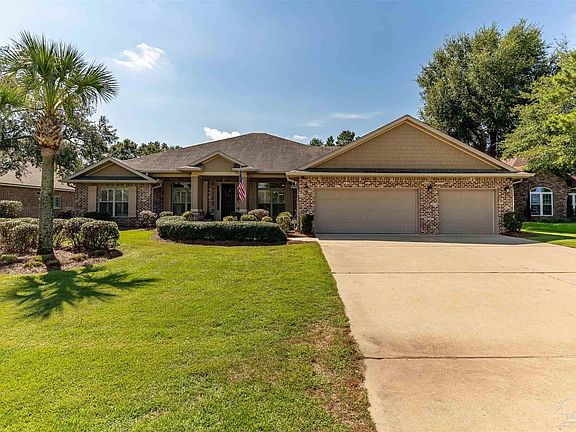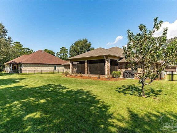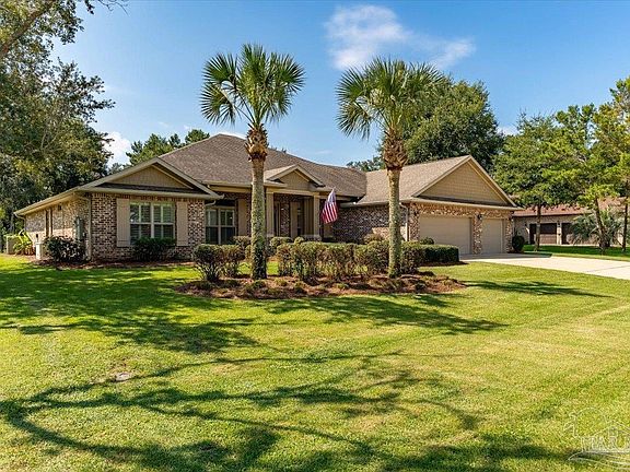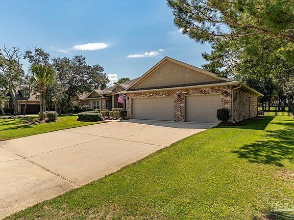 Discover your dream home nestled on the 11th tee of Hidden Creek Golf Course. This custom-built sanctuary blends luxury with practicality, featuring 4 bedrooms, 3 full baths, a study, and a flex room. The heart of the home is a gourmet kitchen with a natural gas cooktop and upgraded cabinetry, perfect for culinary enthusiasts. Step outside to the spacious 660 sq ft screened patio and immerse yourself in stunning golf course views. The oversized 3-car garage offers ample parking space, while professionally installed aluminum hurricane shutters provide both ease of use and peace of mind. Modern amenities abound, including a whole-house generator, Bosch security system, and energy-efficient features like a tankless water heater and spray foam insulation. For added peace of mind, the home boasts a unique optional safe room with sheathed walls. Located in the desirable Flood Zone X with an assumable termite warranty, this property combines beauty with practicality. Elegant touches like crown molding, plantation shutters, and an electric fireplace complete this Florida paradise. Experience the perfect blend of golf course living and modern luxury, where every detail has been thoughtfully considered. Your slice of paradise awaits at 2932 PGA Blvd., Navarre, Florida!