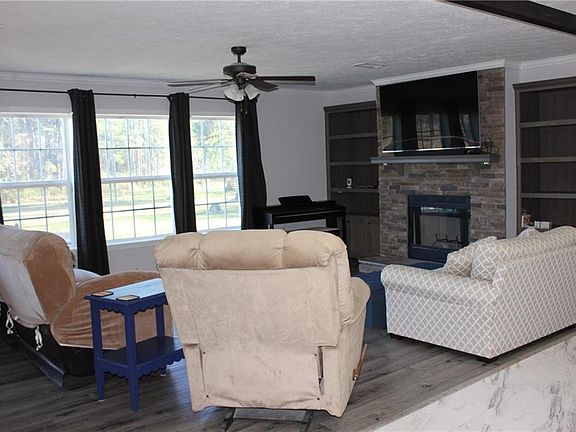 Move-in ready home on 1.70 acres with covered back porch and detached workshop/shed. Large open floor plan with fireplace in living room w/built-ins, separate den, kitchen with center island, lots of cabinetry and countertop space, coffee bar area in utility/pantry. Huge primary bedroom with walk-in closet. Bathroom features double lavatories, separate corner tub, and large walk-in shower. No carpet! Sellers are leaving all appliances, 2 TV's and a piano.