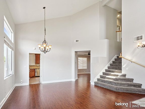 Fall in love with this captivating 4-bedroom, 3-bath home in Hayward, where modern updates blend with timeless appeal. Freshly landscaped and boasting new interior paint, this home feels both refreshed and welcoming from the moment you arrive. Inside, soaring ceilings and rich hardwood floors create an expansive, bright atmosphere, while abundant natural light enhances every corner. Any culinary enthusiast will appreciate the kitchen's thoughtful design, complete with spacious granite countertops, ample cabinetry, and stainless steel appliances that make meal prep a joy. Glass doors in the kitchen and dining area lead out to a sunny, fenced-in backyard, perfect for outdoor dining or quiet afternoons in your personal oasis. The primary bedroom offers a serene retreat with large windows dressed in elegant plantation shutters, giving you control over light and privacy. A generous walk-in closet ensures plenty of storage, while the ensuite bathroom impresses with a sleek double vanity, a luxurious soaking tub, and a glass-enclosed shower with handsome black fixtures. Pet-friendly and featuring a useful storage shed in the yard, this home also includes an attached two-car garage for added convenience. Situated with easy access to I-880, CA 92, and the Hayward BART station, commuting is hassle-free. Plus, proximity to Costco, Union Landing, Starbucks, restaurants, and parks ensures that everything you need is just moments away.