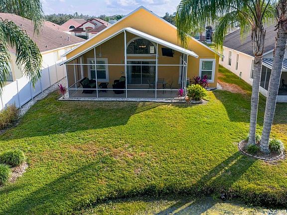 One or more photo(s) has been virtually staged. This exceptional home stands out from the moment you arrive. The curb appeal has immaculate landscaping and a pristine exterior that reflects true pride of ownership. Inside, the home feels even better than brand new, offering thoughtful updates, and a serene conservation setting, all with no HOA restrictions. A formal entry welcomes you with an elegant custom tile inlay and a direct sightline to the tranquil pond and lush conservation beyond. A convenient coat closet adds functionality perfect for when you are walking in from a rainy or chilly day. Vaulted ceilings flow through the main living areas, enhancing the open and airy feel. Just off the foyer is a versatile fourth bedroom that can also serve as an office or den. The dining room is spacious and ideal for gatherings, overlooking the well-designed kitchen. The kitchen features granite countertops, a coordinating tile backsplash, solid wood Kraftmaid cabinetry, under-cabinet lighting, extra storage above the refrigerator, and multiple additional cabinets placed for maximum efficiency. The family room offers generous space for daily living and entertaining, complete with pre-wiring for a surround sound system. Designed for privacy, the primary suite is quietly placed at the back of the home, where wide pond views set the perfect tone for unwinding. The en-suite bathroom has been fully remodeled and includes dual sinks, a walk-in shower, a heated jetted soaking tub, and a custom walk-in closet. All bedrooms feature Lifeproof luxury vinyl flooring and custom closet organizers, while the main areas and bathrooms offer 20x20 porcelain tile for style and durability. Outdoor living is a highlight with an oversized solid insulated lania roof equipped with two ceiling fans, a mounted TV that conveys, and a designated doggie area for rainy days. Enjoy the serene natural backdrop with sweeping views of the pond and conservation area for privacy and tranquility. Additional upgrades include dual-pane low-E windows with argon gas, a tankless water heater, a 2023 water softener, mature landscaping, a reclaimed-water irrigation system, faux wood blinds, and custom cabinetry in the garage. The roof features dimensional shingles with commercial-grade reinforced underlayment, and the exterior paint includes a UAUB blocker for long-lasting protection. With no HOA, city utilities, and CDD fees that include trash and recycling services, this home combines comfort, freedom, and exceptional care in one remarkable package. All while being just minutes from Wesley Chapel’s best shopping, grocery stores, dining, major hospitals, top-rated schools, and quick access to I-75 for an easy commute. Everyday convenience meets unmatched tranquility in this beautifully maintained home.