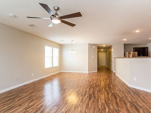 Open floor planStainless-steel appliancesCeiling fansDen and dining areaWood and tile flooringCovered patioLight-filled bedrooms