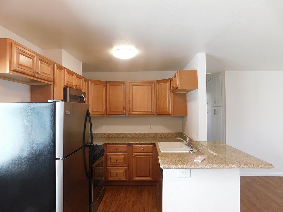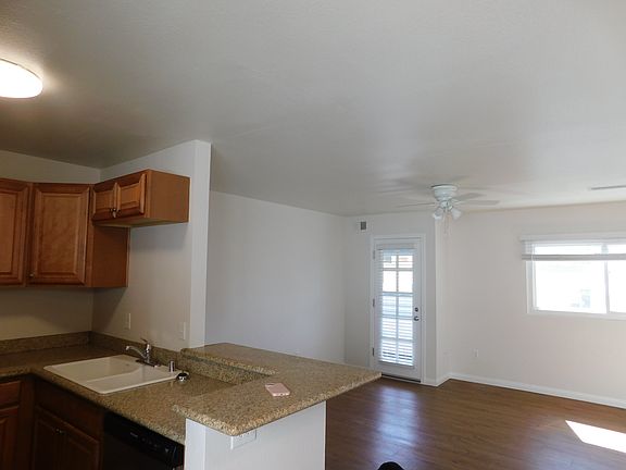 2 Bedroom 2 Bath Open floor plan Upstairs Condo Style Unit that sits over covered parking area. Large galley style kitchen with Granite counter tops, built in microwave, dishwasher, gas range and full size refrigerator. Dining room is just left of kitchen. Breakfast bar, Large balcony. Dual glazed white windows that double side for great air flow. Hardwood style flooring, throughout the unit. One large master suite with one wall of closet, with built in organizers, mirrored closet doors and a full size bathroom. 2nd bedroom has bathroom in hallway, lots of cabinets along hallway. Both bedrooms have plush grey carpeting, ceiling fans and there is also a system that takes the heat outside of the unit.