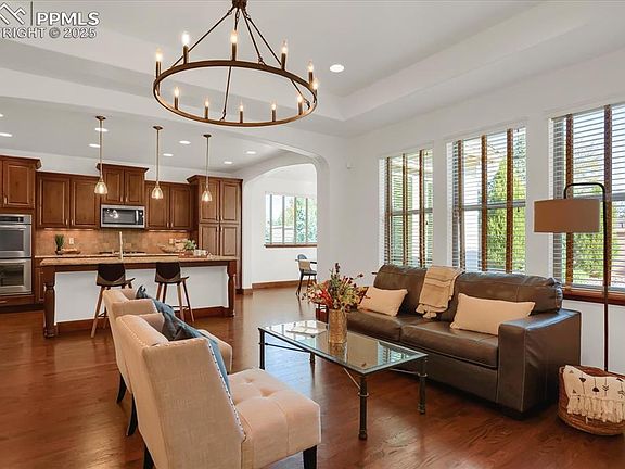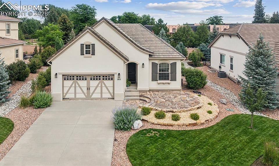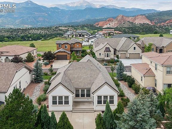 Ranch style stucco home, Garden of the Gods Park and trails minutes away! Beautiful mountain views with spectacular sunsets to be enjoyed front the front room or front patio and the southeast area of the back and side yard. Twelve top-notch Neighborhood pickleball and tennis courts walking distance at the end of the street! This location also allows for easy access to Downtown. Impressive eight-foot cherry finished alder doors, rich cherry finished alder cabinetry. Attractive cherry finished real hard wood floors on the main level, the dining room has French doors that open to the backyard. Superior quality and designed with modern main level living in mind. Large kitchen with center island, double oven, granite counters, gas range and two cabinet-pantry units. There is lots of extra room with a full-sized finished basement with 9' ceilings, two additional bedrooms, jack-and-jill bath and huge family room. Fully finished and insulated garage with epozy flooring. Cathedral Ridge is a privately gated community adjacent to the Garden of the Gods Country Club/Kissing Camels Golf Course (membership required) featuring a 27-hole golf course along with an International Spa and Wellness Center.