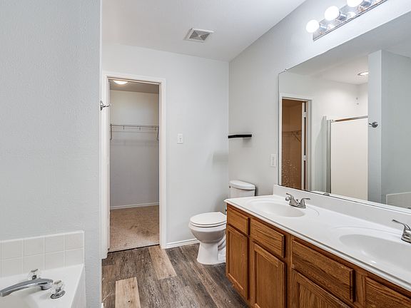 FRESHLY UPDATED three bedroom, two and a half bath two-story home, for LEASE in McKinney ISD! Open floorplan living and dining offers a great space for gathering and entertaining. Open kitchen offers endless possibilities for mealtime. Kitchen appliances include range, dishwasher, microwave AND refrigerator. Enjoy all hard flooring downstairs & all brand new carpet upstairs. All three bedrooms located upstairs including huge primary featuring en suite bathroom with dual sinks, garden tub and separate walk-in shower, complete with spacious walk-in closet. Incredibly LARGE backyard with plenty space to run around, entertain or just relax. Less than a 5 minute drive to most major shopping stores and restaurants. Convenient access to 75 & 380.