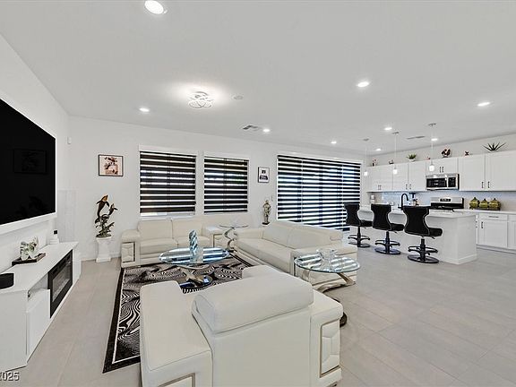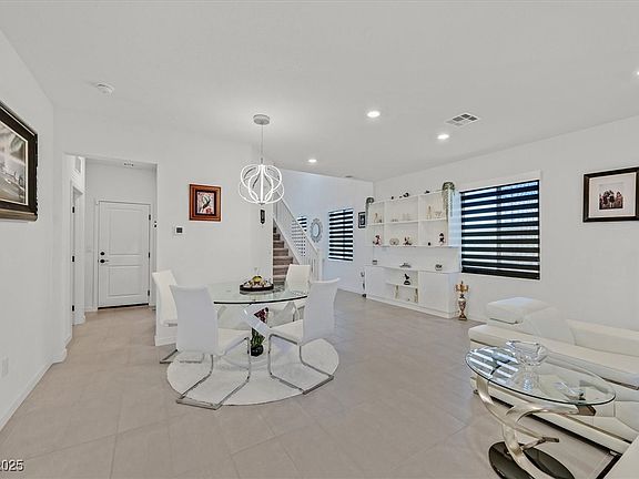 Elegantly upgraded 4-bedroom home in prime North Las Vegas location, offering easy access to top schools, shopping, freeways, and just minutes from the Las Vegas Strip. This beautifully designed residence features an open-concept layout with custom flooring and designer paint throughout. Enjoy a full bedroom and bath on the main level perfect for guests or extended family. The spacious family room flows into a chef-inspired kitchen with level 3 quartz countertops, custom cabinetry, stainless steel appliances, and a large center island. Upstairs includes a versatile loft ideal for an office, gym, or media room, plus a generous primary suite with walk-in closets and a spa-style bath. Two additional bedrooms complete the upper level. Outside, the oversized lot features a private, low-maintenance yard with synthetic turf and a covered patio perfect for relaxing or entertaining! No expense was spared to make this home purely luxurious!