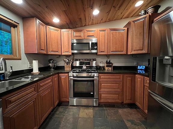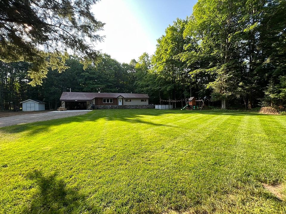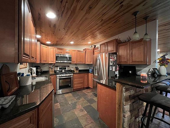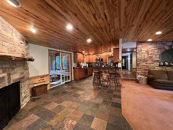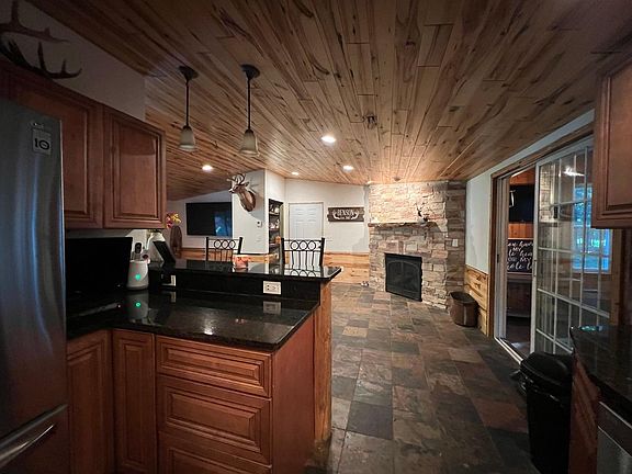 Stunning interior with extensive renovation and professional jaw dropping stonework throughout! This 3-bedroom home is only a few miles from town but is tucked away on a very private 1 acre parcel. There is 24 x 26 attached garage featuring a large overhang supported by beautiful stone pillars that accent the stone on the lower exterior front of home. Inside you’ll find a cathedral wood ceiling, new kitchen with Cherry cabinets, granite counter tops, breakfast bar and new SS appliances. Wonderful 3 season room, very spacious living, impressive fireplace and stone wall with arch & upgraded bathroom with newer washer and dryer. There is a full basement with newer hydronic heat boiler with 3 zones, new wiring throughout, a metal roof & large storage shed with power. This gem includes all appliances and furniture, is located with direct access to the snowmobile and ATV/UTV trails, start enjoying right away!