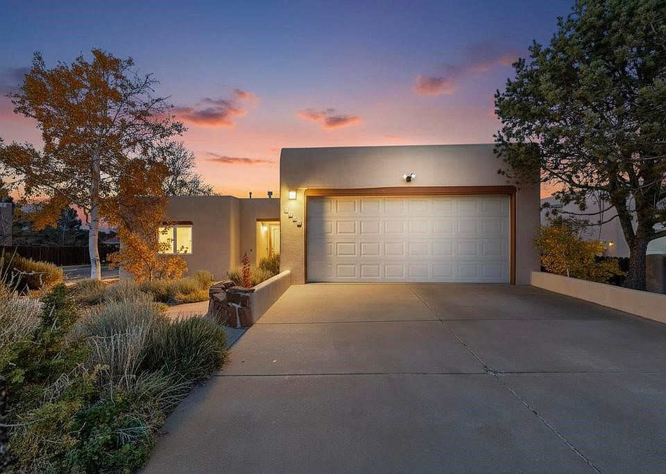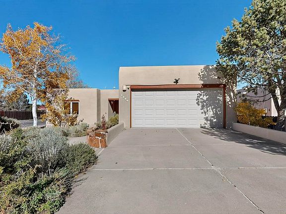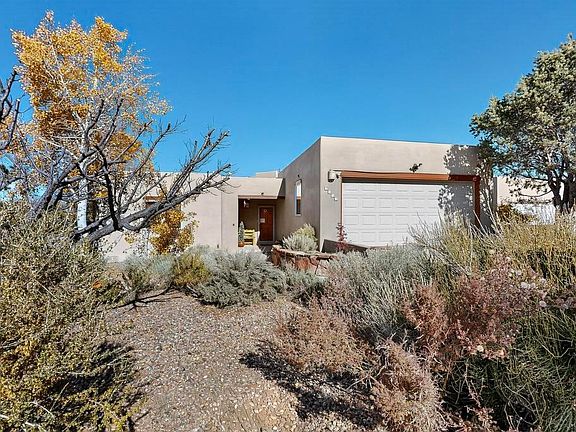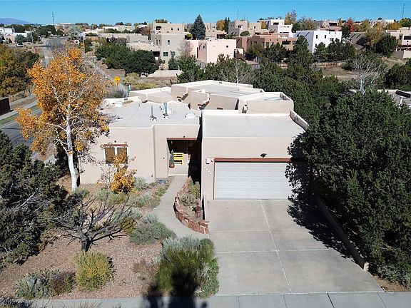 Don’t miss this charming single-level home in Pueblos del Sol featuring three bedrooms and two bathrooms. This residence showcases classic Santa Fe details such as Vigas and a cozy Kiva fireplace. Lots of natural light streaming in from five skylights throughout the home. The open floor plan provides great flow and comfortable bedroom separation, while the spacious deck with a solid portal—accessible from both the living room and primary bedroom—offers the perfect place to relax and enjoy the beautiful mountain views. York Central air conditioning and a two-car garage complete this wonderful Santa Fe home. Additionally, the raised subfloor design allows for easy access to plumbing for repairs or modifications. Situated on a large, beautifully landscaped corner lot with native plants and an apricot tree, the property backs onto a greenbelt for added privacy. Recent updates include a finished garage with a new door (2016), a new TPO roof (2021), new coyote and dog-eared fencing (2021), stucco patched and stained (2025), a new hot water heater (2025), and a new sump pump (2023). We invite you to come take a look at this wonderful property.