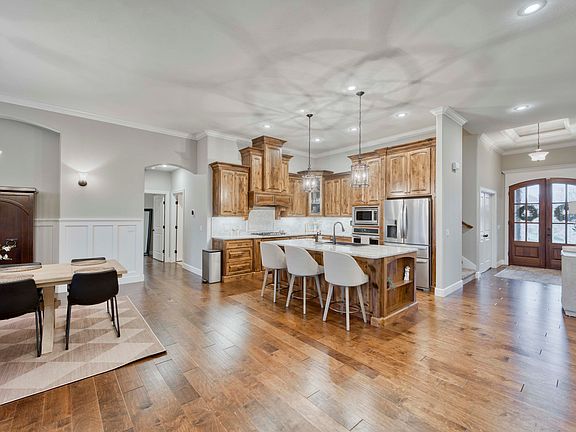 Spectacular, high-quality home in the desirable Ruskin Heights community--one of Springfield's most sought-after southeast locations just east of Hwy 65. This impressive all-brick home with stone accents features 5 bedrooms, 3 full bathrooms, and a 3-car garage, along with beautifully professionally landscaped front and back yards and an inground sprinkler system.A set of solid wood double doors welcomes you into an expansive open floor plan with tall ceilings and hand-scraped hardwood flooring. The spacious living room boasts a stone gas fireplace accented with sconces. The kitchen offers alder cabinetry, stainless steel appliances including a gas cooktop, granite countertops, and a large island with seating. A formal dining room with elegant wainscoting sits just off the kitchen.The split bedroom layout includes four bedrooms on the main floor. The hallway bathroom features dual sinks, while the primary suite offers dual vanities, a jetted tub, tiled walk-in shower, private water closet, and a generous walk-in closet.Upstairs, you'll find a versatile bonus living area or 5th bedroom, complete with a full bathroom and convenient walk-in attic storage.Enjoy outdoor living on the fantastic screened-in deck, equipped with automated privacy screens, electrical outlets, and TV power. The backyard is fully enclosed with iron fencing.Additional upgrades include crown molding, plantation blinds throughout, built-in shelving in the bathrooms, Ecobee thermostats, a whole-home humidifier, heated and cooled garage with epoxy floors and stand-up crawl space storage with lighting.Don't miss this exceptional home in a prime southeast Springfield location!