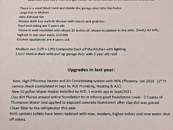 Well maintained 18 yr old home. (No Realtor fees paid at this price listing.) Financing Pre Qual Letter, please. New heating and air with, high 96% efficiency furnace last year. (Dec 2020). New water heater, 9/2021. Kitchen appliances are 4 years old. Back deck with lighting. Full size basement windows. 12x12 well maintained shed with electricity,(new roof 4 years ago), Attic fan, new roof and siding with insulation 5 years ago. 18 inches of blown insulation in the attic. New taller toilets in main & master bath. Recent preventative maintenance.