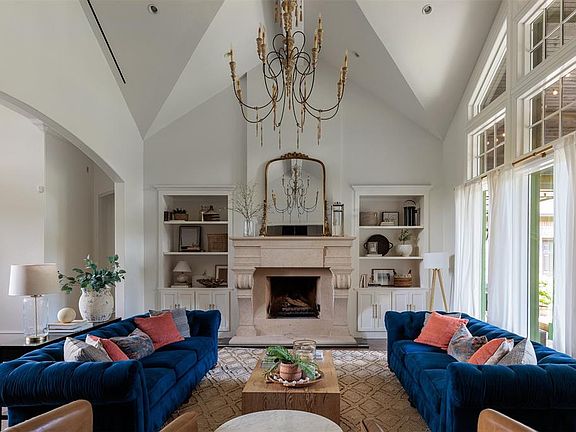 A truly magical offering in Sweetwater—one of the most enchanting homes, set on over 2 lush acres. Designed with timeless storybook charm, this Tudor Revival-inspired beauty feels like it belongs in a fairytale, with steep gables and softly rounded edges that quietly nod to the magic of Disney’s Pinocchio Village Haus. The exterior blends stone, brick, half-timbered accents, and hand-applied stucco to showcase enduring craftsmanship. The lantern-lit, arched entry makes a stunning first impression, welcoming you into interiors that balance warmth, character, and livability. Rich wood floors, soft alabaster walls, and soaring ceilings create an airy yet grounded feel, with the living room anchored by a striking cast stone fireplace with wood-burning hearth. Pella windows throughout fill the home with natural light and frame peaceful views of the surrounding landscape. The kitchen is nothing short of exquisite—custom smoke blue cabinetry, large butcher block island with seating for five, and high-end appliances including a six-burner range with griddle, double ovens, convection oven, large pantry and more. A sunny dining area is perfect for both quiet mornings and lively gatherings. The private primary suite offers a cozy fireplace, serene en suite bath, and dreamy closet. Library with fireplace, bonus room for fitness or play, bed with ensuite and home theatre complete the main level—made even better by radiant heated floors throughout. Upstairs, three bedrooms, one with a charming Juliet balcony, each have private en suite baths. Two laundry rooms—up and down—plus extra bonus room add everyday ease. Private 717 sq ft apartment (included in overall count), provides complete living quarters for live-in or extended stays. Outdoor living shines: covered back patio, wood-burning fireplace and pickleball court. Sweetwater’s gated setting, winding streets, mature trees, and two scenic ponds offer a lifestyle that feels both private and connected—a rare, timeless retreat.