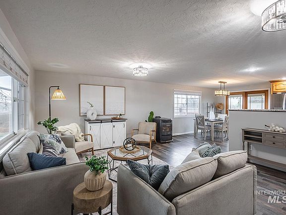 Experience peaceful country living surrounded by open farmland on over half an acre with no HOA. This beautifully updated home features fresh paint, updated lighting, LVP flooring, new carpet, and a cozy pellet fireplace. The kitchen boasts hardwood cabinets, stone countertops, and stainless steel appliances, while both bathrooms offer modern tile showers with stylish, updated finishes. The garage includes freshly coated floors, a new door and opener, ample storage, pantry space, and a dedicated freezer nook. Step outside to a trex-deck overlooking cleared land with Owyhee Mountain views, a powered shed, brand-new gutters, a brand-new irrigation pump, and plenty of parking for all your toys. With large access gates into the yard and plenty of room to grow, you’ll have endless possibilities whether adding a future shop, or adjusting fencing to create your own private retreat. The scenic drive is lined with corn, potatoes, and hops, showcasing the area’s agricultural charm and is close to both Parma and Wilder.