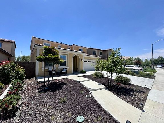 Welcome to this stunning two story 4 bedroom home nestled in the Heritage Lakes community of Menifee! As you approach, you're immediately struck by the home's inviting curb appeal, featuring a lengthy driveway, cozy seating area, and effortlessly maintained landscaping. Inside, you're greeted by the airy ambiance created by high ceilings and a light paint palette that flows seamlessly throughout the open floorplan. Conveniently situated off the entryway is a bedroom and a full bathroom. The heart of the home lies in the expansive kitchen, where dark cabinets, granite countertops, and stainless steel appliances await! With ample storage provided by the walk-in pantry, meal prep and entertaining become effortless. The kitchen seamlessly transitions into a dining area and the spacious family room, which is bathed in natural light. Additionally, a formal dining room adjacent to the family room offers an elegant setting for special occasions. Heading up the stairs, you'll find a generous loft space, ideal for use as an office, playroom, media area, or home gym. The laundry room, complete with storage, adds convenience to the upper level. The primary bedroom is a true retreat, boasting an impressive size and an ensuite bathroom with dual sinks, a soaking tub, walk in shower, all complemented by dual sinks for added convenience. The backyard oasis is beautiful and highlighted with artificial turf, concrete and a covered patio area, perfect for either relaxing or entertaining year-round! With its spacious layout, modern amenities, and desirable location, this home offers the perfect blend of comfort and style and is ready for showings! The Heritage Lakes community provides tons of resort style amenities including a Clubhouse, 2 Swimming Pools, Splash Pads, private Lake Access, Fitness Center, Tot lots, Sports Parks and much more!