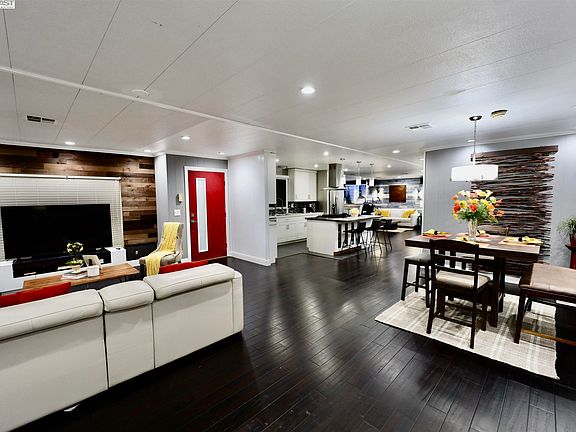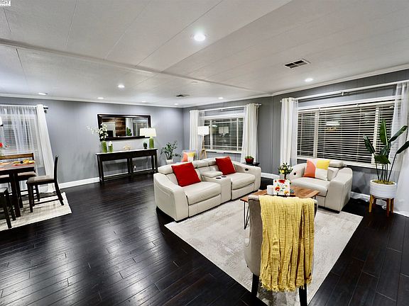 A large triple-wide mobile home situated in New England Villa Mobile Home Park (55+ Community). This amazing remodeled 2-bedrooms & 2 full baths home complete with a bright and spacious living room & airy family room w/ wet bar. Throughout the living space offered engineered hardwood flooring & tile flooring in the bathrooms. The kitchen has been updated w/ quartz countertop, glass tile back-flash, plenty of cabinetry, large island, stainless appliances. Kitchen open to family room which offers a sliding door to porch. Primary bedroom has a large walk-in closet and spacious bathrooms w/ stall shower & vanity. Guest bedroom is spacious w/ large closet. Hallway bathroom has a single sink, stall shower & additional storage. All windows & sliding door are dual pane. Close to shopping. Clubhouse has organized events, plus there is a pool AND spa!