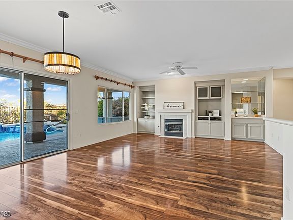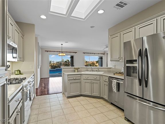 Stunning single-story retreat with a casita nestled in one of Henderson’s most desirable 55+ golf course communities. This 3-bedroom + den, 3 baths with full panoramic unobstructed Las Vegas Strip, mountain, & sunset views. Situated on an elevated lot with no neighbors behind, the home features an oversized private pool and spa, & a covered patio spanning the entire length of the house — perfect for entertaining or morning coffee with a view. Gated courtyard entrance then you walk into the wide-open living room with a fireplace & wet bar overlooking the backyard pool and views. Offers a split floorplan and a den with peaceful views & direct access to the backyard. Kitchen has skylights & all appliances included & a 2-car tandem garage with built-in storage cabinets. Freshly painted on exterior and year round blooms in the yard. Enjoy access to 3 world-class recreation centers, including indoor & outdoor pools, pickleball courts, golf course, classes, & a vibrant social calendar.