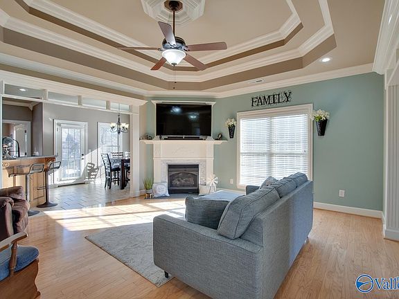 OPEN HOUSE SUN, 2/19! This home's luxury upgrades include crown molding, tile & real hardwood throughout, double trey ceilings in 3 rooms, ceil fans in all bedrooms, and a beautiful gas log fireplace in the living room. The large kitchen is a chef’s dream with so many cabinets and so much counter space. The owners’ suite includes a large ensuite bath and 2 walk-in closets and is isolated from the other bedrooms. Beautiful flex room w/wainscotting can be formal dining or office. Extra space in the garage includes a STORM SHELTER. Fenced backyard. Since 2020 HVAC, Roof, WH and garage door openers have been replaced. Centrally located <2 miles from all public schools & convenient to Hsv area.