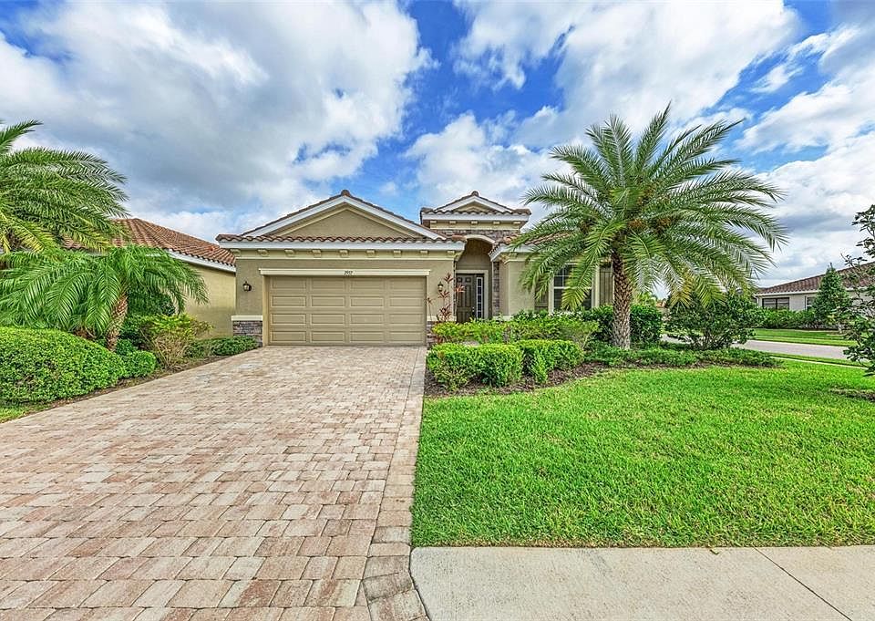 Beautifully Maintained 3 bd / 3Ba with a Large Den / Office. Over 2000 sq. ft., This is an open concept floor plan, featuring a spacious kitchen overlooking large living and dining areas that flow out to a covered lanai. Your master bedroom offers a recessed ceiling w/ fan, walk-in closets, arched doorway entry, and spacious master bathroom with double sinks, shower and separate tub. All bedrooms have ceiling fans. Laundry room. Upgraded Kitchen / Stainless Appliances / Granite Countertops. Hurricane Shutters available, in garage, when needed. 2 car garage with remote opener. Owner takes care of yard maintenance and care. Sliding doors off Living Room into screened Patio. Private back yard. Safe & Quiet neighborhood. SOLEIL is a gated community. It boasts a resort style pool and club house, fitness center, bocce ball court, and dog park. Ideally located just north of University Parkway, for easy access to downtown Sarasota, airport, University Town Center, I-75, and local beaches. House is close to University Town Center Shopping / Whole Foods / Publix / Walmart / Target / Best Buy and loads of other Stores and Restaurants. Beaches are 15 minutes away. I-75 is less about 5 minutes away. 1-3 Year Lease available. Owner pays for Lawn / Tree service. Small pets ok w/ security deposit