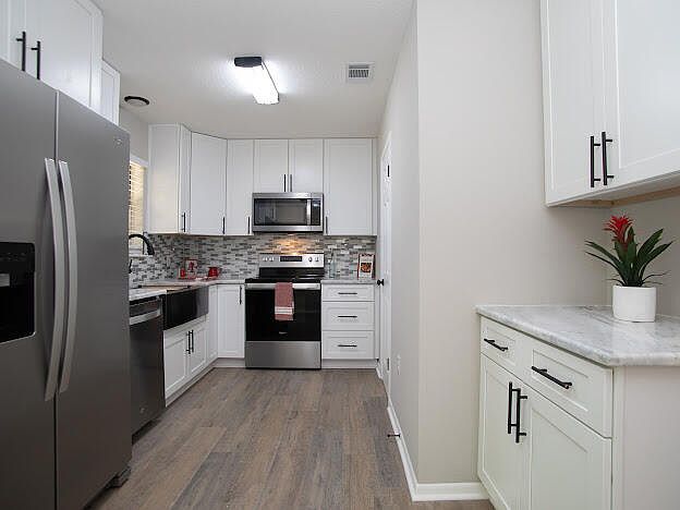 100% Redone! 100% Move In Ready! 3 BD 2 B, Home completely updated. New Kitchen Cabinets, Granite Counter-tops, New Backsplash, New Stainless steel appliances, Lights & Sink. New flooring throughout home with Laminate in main areas, Luxury Vinyl in baths and Carpet in bedrooms. New Vanities in baths, lights, mirrors, Tub with new tile one bath, New shower/tile 2nd bath. New fans and lights, New paint inside & out. Has copper wiring....Roof 2012 approx., HVAC 2017 and Hot Water Heater 2015. Room sizes approx. buyer to confirm.