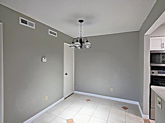 Step onto elegant large-format tile flooring that flows seamlessly throughout the entire unit, highlighted by beautiful, integrated diamond-shaped inlays. The walls are painted in a soothing, contemporary gray hue, perfectly complemented by crisp white trim and abundant natural light.