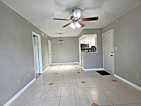 Open-Concept Living: Enjoy an expansive main living area featuring a contemporary ceiling fan and an elegant chandelier in the dedicated dining space.
