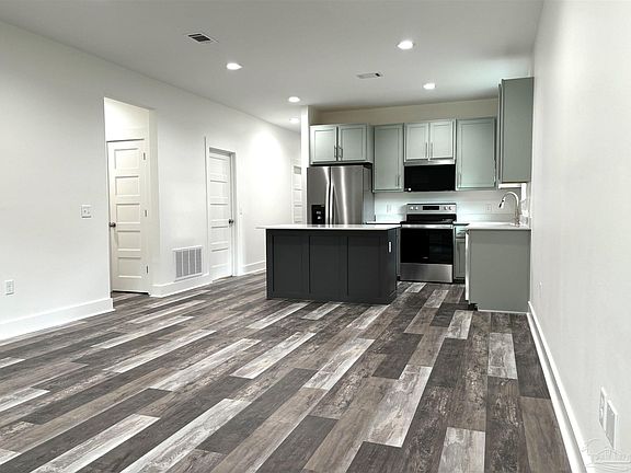 Enjoy the pleasures of new construction with this new 2024 built home on 0.38 acres in Crestview, complete with no city taxes! After pulling up the spacious driveway, take a minute to enjoy the views from the charming front porch with Hardie plank lap siding and a well-crafted tongue and groove pine ceiling. As you step through the front door, you’re greeted by an open-concept space that seamlessly combines the living room and kitchen area, featuring 9-foot high ceilings with foam roof insulation and elegant vinyl plank flooring running throughout. The kitchen maximizes storage with custom-built cabinets and a breakfast bar, paired with glittering quartzite countertops and stainless steel appliances. Off the kitchen, a vestibule connects the laundry room and entry to a one-car garage, with a custom mudroom bench for organization. Down the hall, on the left you'll find a hall closet and a bathroom shared by generously sized bedrooms 1 and 2 on the right-hand side. At the back of the house, the spacious master bedroom attaches to an ensuite with abundant storage, featuring double vanities with quartzite countertops, a linen closet, and a walk-in closet. Out the back door is the covered porch overlooking a large expanse of yard for the puppy to play underneath the shade of large oak trees. This new home is situated the perfect distance from Crestview’s best spots - less than 5 minutes to Azteca, Old Spanish Trail Park, Twin Hills Park, and The Marquis Cinema. Ready to see your new home? Schedule a showing today!