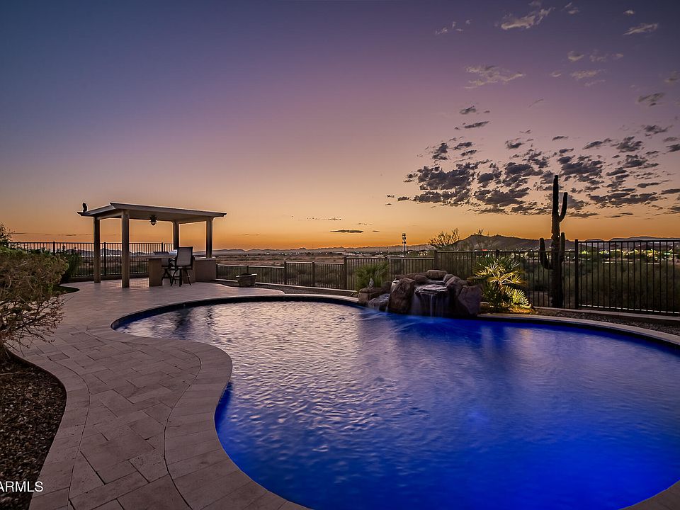 Welcome to your dream home! Prepare to be wowed by breathtaking views and stunning sunsets. The backyard is an entertainer's paradise, featuring a heated Pebble Tec pool with a travertine surround, set against incredible mountain views. The large pergola with a built-in BBQ makes outdoor dining a delight. Inside, the open floor plan is enhanced with upgraded plank tile flooring, creating a seamless flow. The kitchen is a chef's dream, showcasing granite countertops and beautiful cabinets, all bathed in an abundance of natural light. This is your once-in-a-lifetime chance to own a home with such spectacular views in this coveted gated community. Thoughtfully designed to provide the ultimate living experience, this exceptional home is not to be missed!