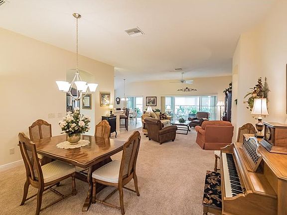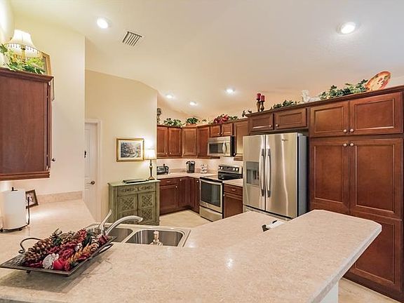 LOVELY 3/2 LANTANA Designer in the Village of GILCHRIST! This well-maintained larger 3 bedroom home has TILE in the foyer, kitchen and baths with carpet throughout the rest of the home. This is an open kitchen with CHERRY cabinetry, upper and lower crown molding with over and under counter LIGHTING, STAINLESS appliances with a smooth top stove and a French door refrigerator, high definition laminate beveled edge counter tops, pull out drawers and a lazy susan! The casual dining area and the living room both open with sliding glass doors out to the attractive, spacious 10x29 GLASS enclosed lanai with insulated, low E windows. This is the best seat in the house and private with shades and landscaping! Outside the lanai, there is an open patio which can easily be expanded! The front guest room has a tray ceiling and a bay window. Both guest rooms do have closets! The master bedroom has a large walk-in closet and the master bath has dual sinks and a WALK-IN SHOWER! The laundry room has extra cabinets and a built-in sink. This is a very comfortable home in a good central location!