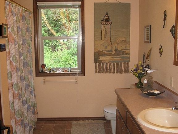 This private 5 bed/3.5 bath hilltop home on nearly 5 acres sits in harmony with its environment. Special touches like stained glass windows, wood trim, & strong horizontal lines draw inspiration from Frank Lloyd Wright. Kitchen w/ unique prairie style shaker cabinetry. Family room w/ rustic wood stove. Master suite w/ private deck, jetted tub, & walk-in shower. Enjoy stunning salt-water & mountain views from nearly every room. Beautiful low-maintenance landscaping in the front, deck & patio in the back. MAIN LEVEL Hardwood floors, Living room with salt-water views, Vaulted ceiling, Skylights, coat closet, Wood trim, Prairie style banister with built-in lights, Oak prairie style shaker kitchen cabinetry, Downdraft range/oven, Recessed lighting, Stained glass windows, Sliding door to deck, Hutch nook with lighting, Office nook, Built-in desk, Laundry room and 1/2 bath, Prairie style light fixtures UPSTAIRS Master bedroom with private deck and stained glass windows, Master bathroom with jetted tub and walk-in shower, 2 additional bedrooms, Full bathroom DOWNSTAIRS Family room with wood stove, Door to patio, Beamed ceiling, 2 more bedrooms, Closets to heat pump and water heater, 3/4 bathroom EXTERIOR On nearly 5 acres, Stunning landscaping, Exposed aggregate sidewalk, Attached 2 car garage with workshop, Circular driveway, Deck with fantastic bird watching, Patio, Mature trees, Storage cellar, Mountain and salt-water views, Blueberry bushes