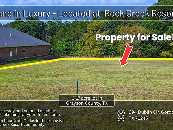 Beautiful 0.14-acre lot located in the Dublin Circle section of Muirfield Village at Rock Creek Resort on Lake Texoma! This premium homesite backs to a ranch with a creek separating it, providing natural privacy and a unique buffer from other properties. Rock Creek is a master-planned, gated community just one hour north of DFW, built around a Jack Nicklaus–designed championship golf course. Residents enjoy access to resort-style amenities: clubhouse with dining, marina with ship store, pool, spa, tennis, fitness center, trails, and more. Flat, buildable lot with utilities available and no time limit to build. Perfect for a full-time home, weekend retreat, or investment.