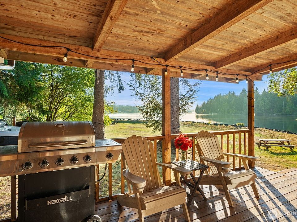 Waterfront retreat on Hammersley Inlet! This 4.61-acre property features 250± ft of western exposure bulkhead waterfront with tidelands plus shared 1/9th lease rights & a creek that meanders along the edge. The 3-bed PNW- style home offers a main-floor layout with upper primary suite, cozy living room w/wood stove, large kitchen, covered deck, hot tub & more! Expansive yard w/ fenced garden space & fruit trees. Many recent upgrades including new roofs, new windows, electrical, reconstructed rock bulkhead, well pump, septic improvement and more! Detached 864 SF shop/craft building with water, wraparound deck & new wiring for stove/fridge—possible ADU? Plus additional outbuilding! Some furnishings negotiable. No HOA/CCRs. Welcome Home!