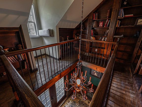 Stunning 3-Story Home with 2-Story Library, Private Setting, and Endless Character! Welcome to this exceptional 3-story home situated on a poured wall basement, offering a rare combination of elegance, functionality, and privacy. Nestled among mature trees with woods surrounding the property on three sides, this home provides the perfect retreat while still offering convenience & comfort. Main Level Highlights: Step into the welcoming foyer that sets the tone for the home's charm & warmth. The formal dining rm is ideal for hosting gatherings, while the formal living rm features a cozy wood-burning fireplace for those crisp evenings. A versatile sitting rm/office/den provides flexible space to meet your lifestyle needs. The heart of the home is the spacious kitchen, complete with custom-built cabinetry, concrete counters,& ample workspace for cooking & entertaining. Off the kitchen, enjoy the bright & inviting sun rm, perfect for morning coffee. A generous laundry rm, half bath, & covered back porch round out the main level. Second Level Highlights: you'll find 3 generously sized bedrms, each with its own walk-in closet. The primary suite is a true retreat, featuring a private bath with a corner soaking tub, separate shower, & 2 separate vanities. A full hall bath serves the additional bedrms. The show-stopping two-story library is located on this level, boasting custom built-in bookshelves & soaring ceilings, perfect for book lovers, collectors, or anyone needing an inspiring space. Third Level Highlights: offers a 4th bedrm, bonus rm, or multi-purpose space that can serve as a playrm, home theater, or game rm. A charming secret door provides direct access to the library, adding a touch of whimsy & uniqueness. Additional Features: Unfinished basement with endless potential for future expansion or storage. Private wooded setting with trees on 3 sides of the home. Fenced-in area perfect for pets, gardening or play. Covered porches& balcony ideal for enjoying nature. With 4 bedrooms, 2.5 baths, 2 story library, and unique architectural details, this home offers a blend of sophistication and comfort. Whether you're entertaining, working from home, or enjoying quiet moments in nature, this property delivers it all.