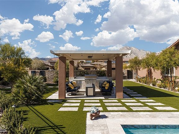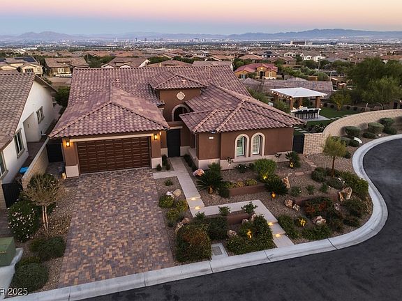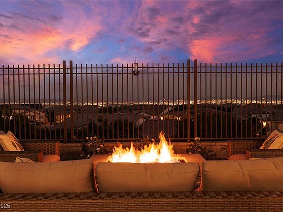 Perched on one of the most extraordinary large elevated lots now available in Summerlin West, this gated single-story Toll Brothers home captures sweeping, unobstructed panoramic views of the Las Vegas Strip and surrounding mountains. A secured gate leads you to a serene courtyard with a cascading waterfall, setting the tone for the refined luxury within. Inside, discover 2,935 sq. ft. of freshly updated living space with new designer flooring, fresh paint, and an open-concept design. Three stacking sliders welcome you to connect to a resort-style backyard featuring a brand-new saltwater pool and spa, two outdoor kitchens, & multiple lounge areas with two fire pits, for seamless indoor–outdoor entertaining. With four bedrooms, including a casita being used as a gym, it is the perfect floor plan. With an expansive "zen" side yard with a covered patio and roses, this cul-de-sac home blends privacy, sophistication, & spectacular scenery. The best lot & views in this price point.