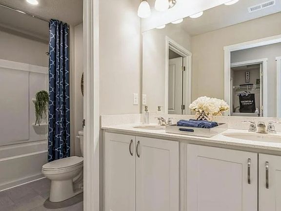 The main level features solid surface flooring throughout and a gourmet kitchen with a large island, perfect for entertaining. Upstairs, the luxurious primary suite includes a walk-in closet and an ensuite bathroom with double vanities. Three additional bedrooms, a full bathroom, and a convenient laundry room with a washer and dryer included complete the upper level.