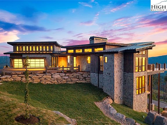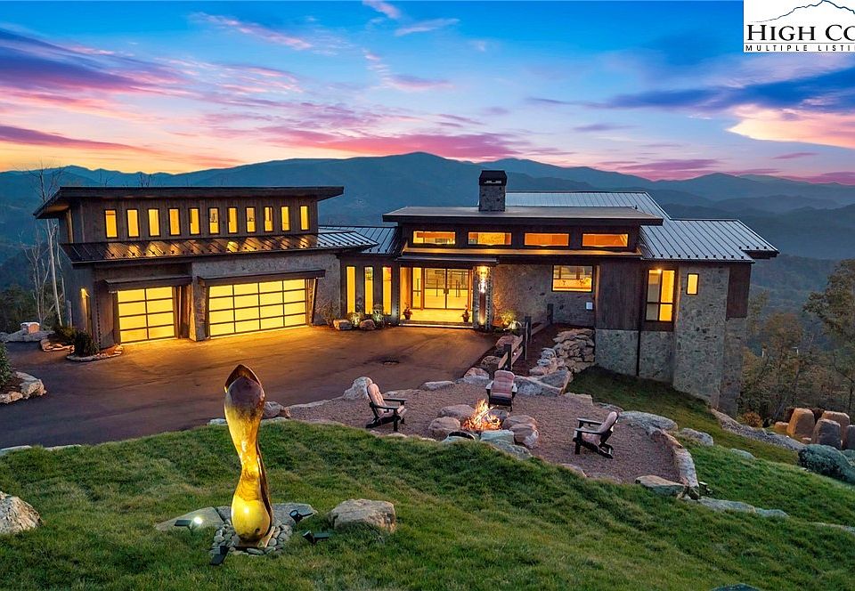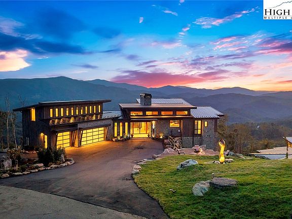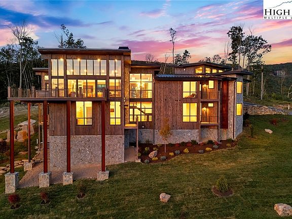 Located in the coveted Sunset Section of The Lodges at Eagles Nest, the Eagles Nest Glass House is an exceptional custom estate redefining mountain living through masterful design and craftsmanship. Developed over three years, this architectural showcase occupies 1.033 acres, where rugged natural beauty blends seamlessly with refined elegance. The residence offers 7,055 sq ft of heated living space, excluding the three-car garage. Perched at 4,400 feet elevation, it commands panoramic views spanning North Carolina to Tennessee mountains, framed by awe-inspiring sunsets. The exterior presents a stylish mountain retreat with white pine-stained wood siding, expansive windows, and rustic metal beams. Over $250,000 was invested in professional landscaping, featuring natural boulders, enhanced lighting, and intricate hardscaping that create an impressive arrival experience. Outdoor living shines with 860+ sq ft of decking, a large hot tub, hand-laid stone pillars, and custom steel beams designed to highlight the sweeping vistas. An inviting fire pit promises memorable evenings beneath the stars. Entry by a grand custom glass door reveals a great room with soaring two-story glass walls that flood the interior with natural light while framing the stunning surroundings. Nickel gap white pine-stained ceilings with rustic beams combine rustic warmth and modern elegance, accented by hand-laid rock, light-toned floors, and a custom rusted gas fireplace. The gourmet kitchen impresses with Onyx Waterfall Island countertops, stainless steel appliances, and a wine cooler. The lower level houses a large custom bar, wine cellar, and a flexible bonus room suited for theater, family gatherings, or games. Throughout are handmade floating handmade stairs, custom wood ceilings, stone accents, custom glass windows, and exterior stonework. There are five spacious bedrooms, each with meticulously finished bathrooms featuring hand-laid stone, marble, various tiles, and teakwood benches. Two additional half-baths are located on each floor. Two generous primary suites, one on the main level and one on the lower level, feature spa-inspired bathrooms and conveniently located adjacent utility rooms. Above the garage, featuring hand painted bronze epoxy floors, lies a distinctive bunk room with a full bath and an expansive rec room. Roughly half of this 275 sq ft area features ceiling heights between 5 and 7 feet. The home is enhanced by commissioned artwork and custom furnishings throughout, reinforcing its one-of-a-kind character. Residents enjoy an extensive amenity offering including ATV and hiking trails, ropes course, playground, dog park, mini-golf, disc golf, archery, versatile sports fields, and courts for volleyball, basketball, tennis, and pickleball. Enjoy world class trout fishing along the Elk River with over 2000 ft of river frontage. Dining options include Eagles Nest Winery, Epic Chophouse and The Sportsman’s Grille. Additional amenities include a 24-hour Dollar General, an outdoor amphitheater offering live entertainment on Saturday evenings from May through October, fitness center, and two helicopter pads. This estate transcends standard mountain homes by flawlessly combining luxury, nature, and architectural brilliance, inviting an elevated mountain lifestyle. Adjacent to this property, a 4,959 sq ft neighboring estate (MLS #258350) is also available, presenting a rare opportunity for main and guest house combination. 4 year home warranty provided