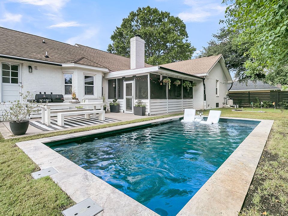 Stunning one level homeHamptons style poolTravertine borderCentral islandScreened in porchLarge dining roomSun ledge